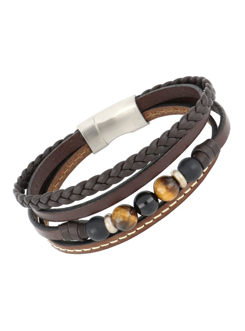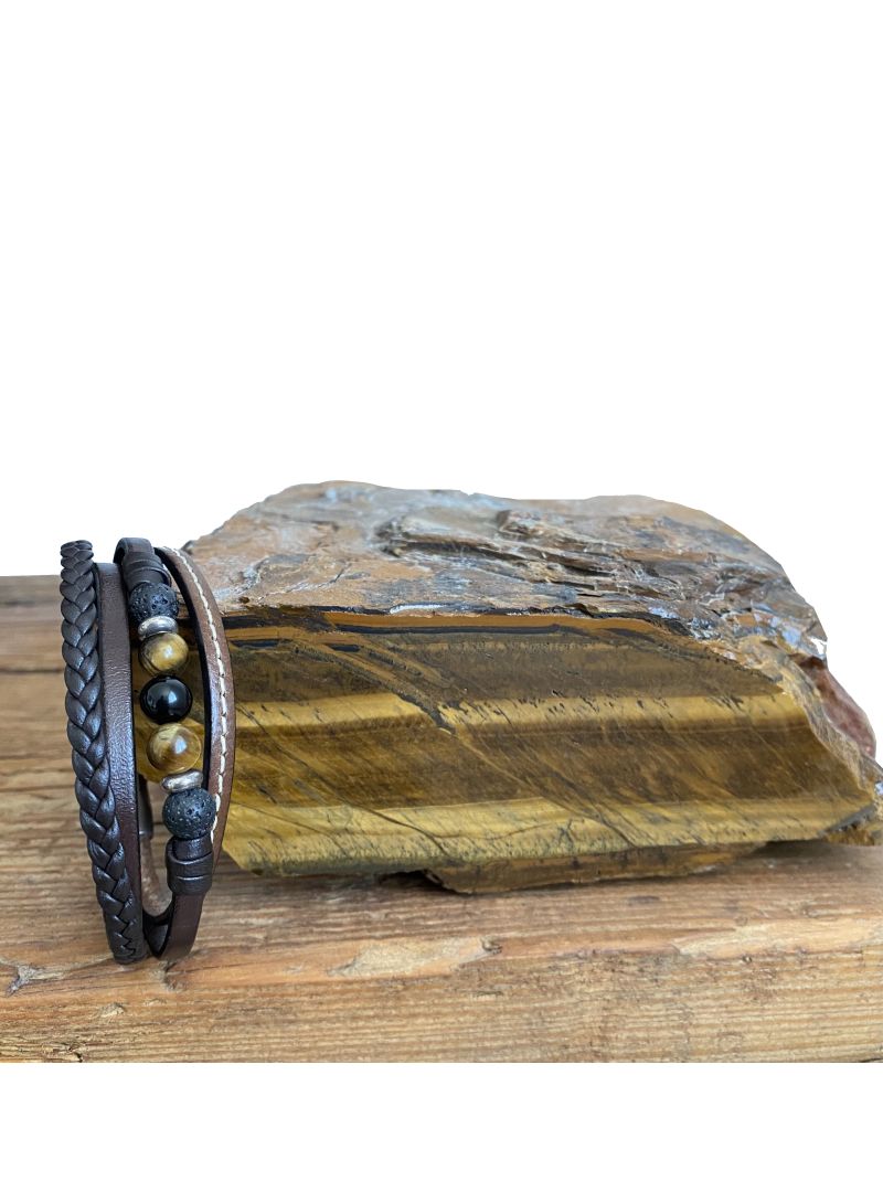 Bracelet en cuir brun, assorti avec des perles en Œil de Tigre, en Lave volcanique et en Onyx